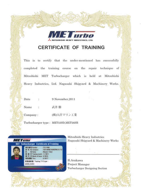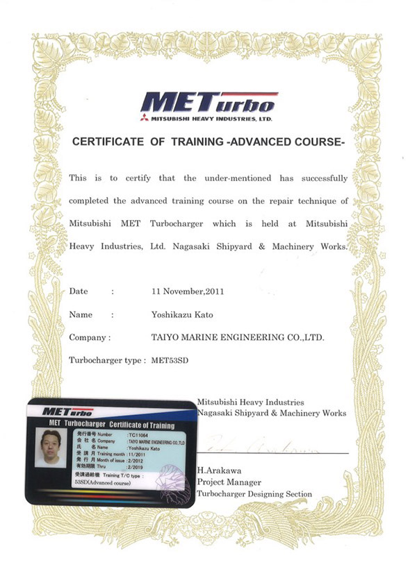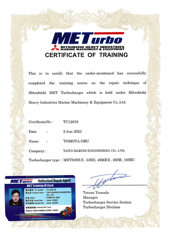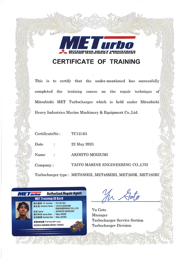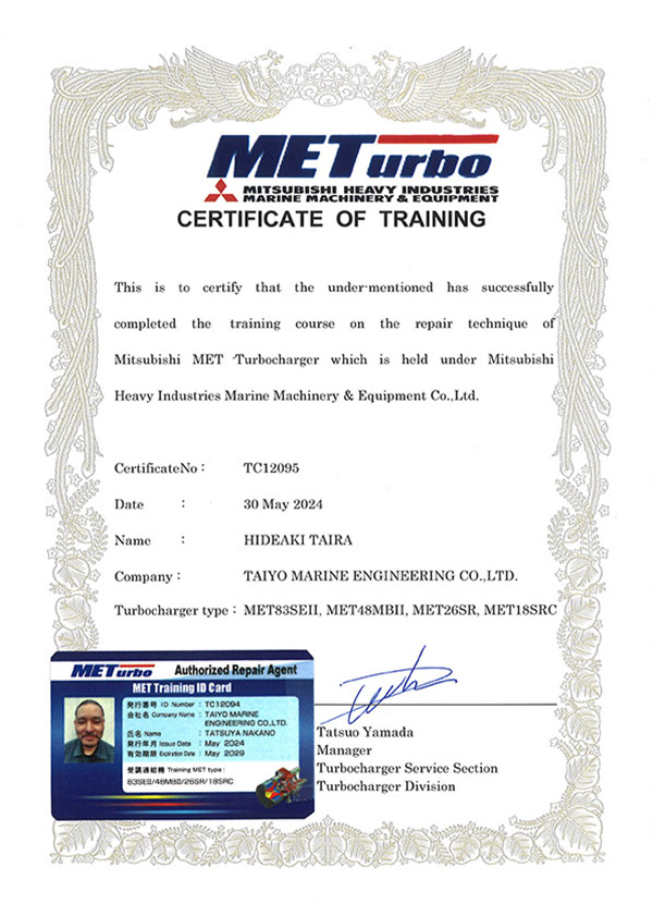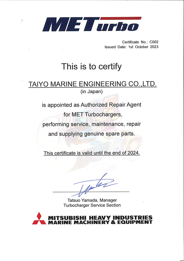 We are a manufacturer-licensed company certified to perform maintenance on Mitsubishi Heavy Industries Marine Machinery & Equipment's MET-type and Mitsui E&S's MAN B&W NA/TCA-type turbochargers.